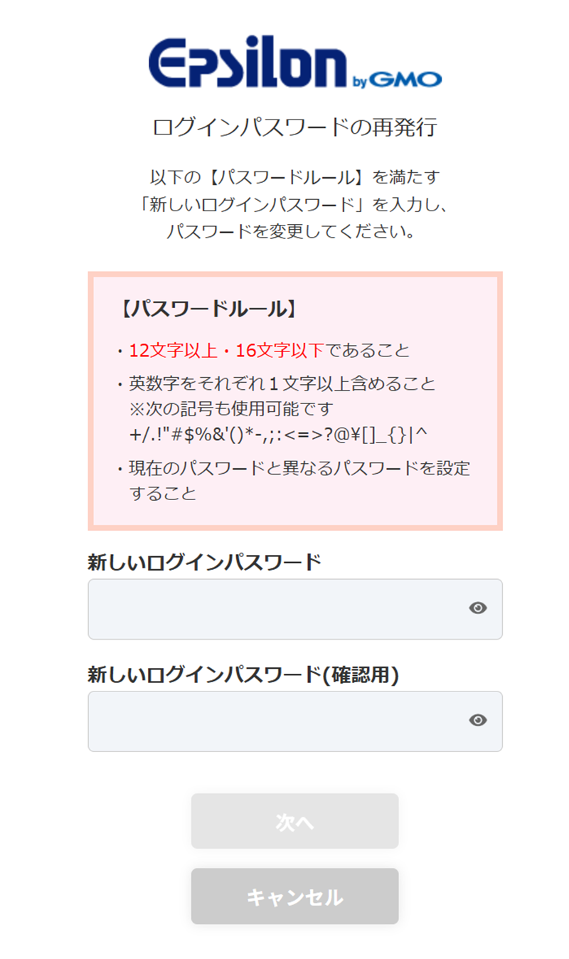 3の認証に成功すると、新しいパスワードの入力画面が表示されます。表示されているパスワードルールに沿って、「新しいログインパスワード」と「新しいログインパスワード(確認用)」を入力し、「次へ」をクリックします。